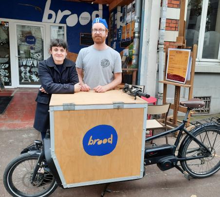 « Bienvenue dans le hammam ! », sourient les fondateurs de la « boulangerie de quartier » Brood. Derrière la porte du 105 boulevard Victor-Hugo à Lille et ses 34°C, ce sont plutôt des odeurs alléchantes de pain qui réveillent les papilles. Les yeux rivés sur une petite horloge, cette fois, c’est au tour de Louis Devos de veiller sur la cuisson de la fournée. Cinq variétés de pains dorent au four accompagnés de brioches. Une gamme restreinte de produits fabriqués à base de farines anciennes et de levain sélectionnés pour leur caractère et leur fabrication paysanne. Sarah Cnudde l’a rejoint, son plan de tournée en tête. C’est elle qui prendra le relais pour la livraison en vélo cargo - biporteur équipé d'une grande caisse- avant de terminer la journée par la vente aux particuliers et la pesée des ingrédients pour la fournée du lendemain.