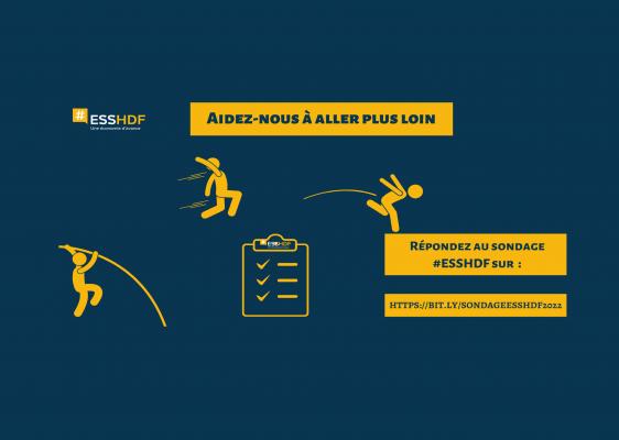 Ce sondage de 3 minutes nous permettra de mieux connaître vos usages, d'identifier vos besoins et apporter des améliorations sur la base de vos retours. Merci d'avance pour vos contributions.La plateforme #ESSHDF a été créée en 2019 à l'initiative de la communauté des communicants ESS des réseaux et structures de l'ESS en Hauts-de-France. Coanimée par la CRESS HDF et soutenue par l'Etat, la Région Hauts-de-France, le Siilab, l'Urssaf et la ChairESS, la plateforme rassemble les informations relatives à l'ESS en région Hauts-de-France.