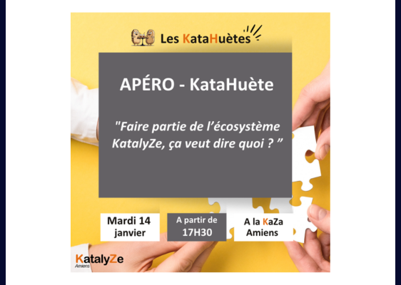 Apéro KataHuète "Faire partie de l'écosystème KatalyZe, ça veut dire quoi ?"Rendez-vous le mardi 14 janvier 2025, pour cette première KataHuète de l’année, nous avons le plaisir de vous inviter dans nos nouveaux locaux : À la KaZa, QG d’Henriette - 7 rue Henriette Dumuin, Amiens