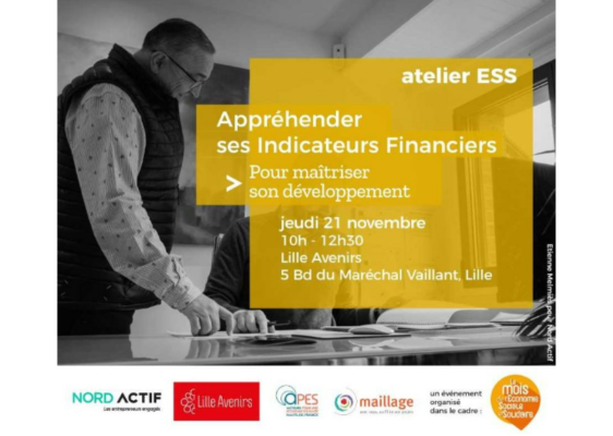 Atelier ESS : Appréhender ses indicateurs financiersDans le cadre du mois de l'ESS, Lille Avenirs et Nord Actif organisent un atelier spécialement conçu pour les structures de l’Économie Sociale et Solidaire (ESS) qui veulent apprendre à piloter leur activité en maîtrisant les indicateurs financiers clés.
