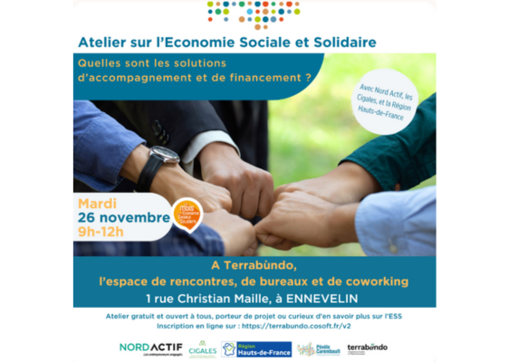 Atelier ESS - Quelles sont les solutions d'accompagnement et de financement ?Matinée dédiée aux structures de l'Economie Sociale et Solidaire, ce mardi 26 novembre de 9h à 12h à Terrabùndo (Ennevelin)