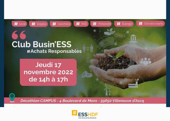Club Busin'ESS - Achats responsablesDans le cadre de la semaine des Achats socialement et écologiquement responsables, la CRESS hauts-de-France organise un temps de rencontre entre structures de l'ESS ayant une offre BtoB (produits et services) à valoriser et les structures de secteur privé et public souhaitant acheter responsable. Cet événement s'inscrit dans le cadre de l'action Busin'ESS de la CRESS HDF visant le développement économique des structures de l'ESS.