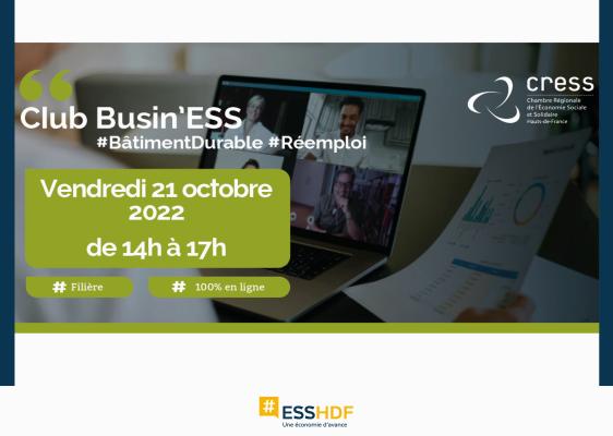 Club Buisn'ESS - Bâtiment durable et réemploi des matériauxDans le cadre de son action Busin’ESS, visant au développement économique des structures de l’ESS, la CRESS organise ce temps de décryptage, d’outillage et d’échanges pour développer votre activité autour de la filière du bâtiment durable et plus précisément du réemploi des matériaux du bâtiment.