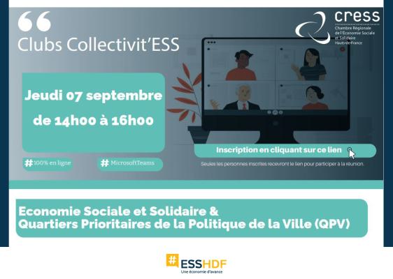 Club Collectivit'ESS : Développer, aménager, équilibrer le territoire : l’Economie Sociale et Solidaire comme solution pour les Quartiers Prioritaires de la Politique de la Ville (QPV) ??Quelles sont les bonnes pratiques à explorer dans l'Economie Sociale et Solidaire dans les quartiers prioritaires de la Politique de la Ville ? Comment l'ESS peut permettre de développer, aménager, équilibrer le territoire ?