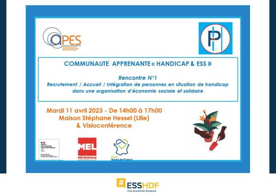 Communauté apprenante "Handicap & ESS"En vue d’accompagner les structures ESS des Hauts-de-France qui le souhaitent à faire évoluer leurs pratiques RH vers davantage d’inclusivité et de diversité, l’Apes initie en 2023 une communauté apprenante intitulée « Handicap & ESS ».