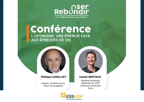 Conférence sur : L’Optimisme : Une Énergie Face aux Épreuves de VieLe Jeudi 19 octobre 2023 à partir de 18h, Philippe Gabilliet, maître de conférences et auteur renommé, et Carole Bertaux, patiente-experte, diplômée de l’UDP Sorbonne Université Paris, partageront leur expertise et leur expérience lors d'une conférence sur le thème de l'optimisme.