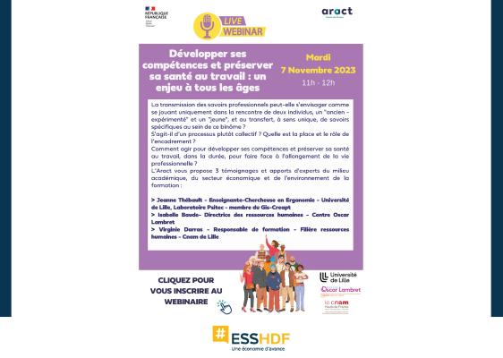 Développer ses compétences et préserver sa santé au travail : un enjeu à tous les âgesL'ARACT organise un webinaire "développer ses compétences et préserver sa santé au travail : un enjeu à tous les âges" le 07 novembre prochain à 11h, en lien avec la thématique seniors également.