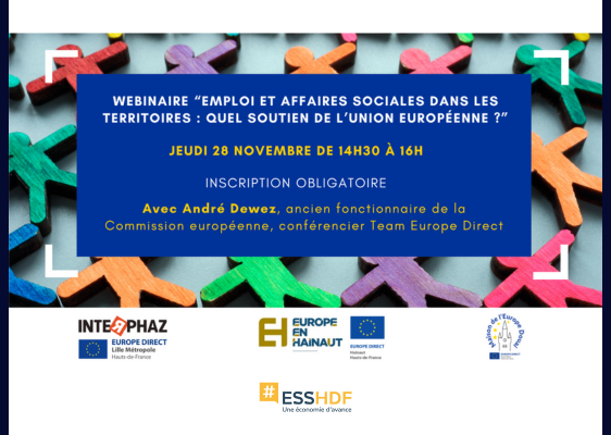 Webinaire "Emploi et affaires sociales dans les territoires : quel soutien de l'Union européenne?"Les centres Europe Direct du Bassin Minier, du Hainaut et de Lille Métropole, organisent un webinaire pour sensibiliser sur les aides de l'UE dans le secteur social et de l'emploi.