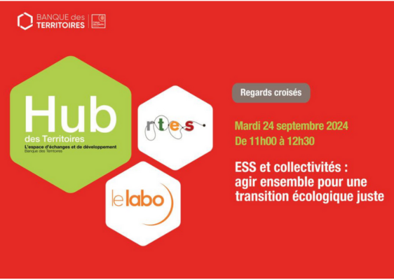 Rencontre du Hub Banque des territoires : ESS et collectivités, agir ensemble pour une transition écologique justeDans la continuité des études du Labo de l'ESS « Réussir une transition écologique juste » et « Vers une société de la coopération », la Banque des Territoires et son Hub co-organisent, avec le Labo de l’ESS et le Réseau des collectivités Territoriales pour une Economie Solidaire (RTES), un évènement sur les coopérations entre acteurs de l’économie sociale et solidaire et collectivités au service d’une transition écologique juste.