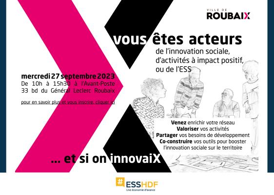 Vous êtes implantés à Roubaix, vous êtes acteurs de l’innovation sociale, d’activités à impact positif, ou de l’ESS (économie sociale et solidaire) : participez à une journée conviviale de rencontres, de travail, et de progression mutuelle.Venez enrichir votre réseau, valoriser vos activités, partager vos besoins de développement, vo-construire vos outils pour booster l’innovation sociale dans vos organisations et sur le territoire. Vous vous reconnaissez ? Inscrivez-vous en cliquant ici