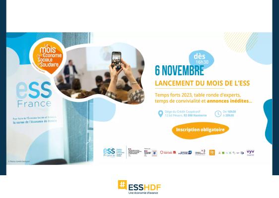Evénement de lancement national du Mois de l'ESS 2023Dans le cadre de la 16ème édition du Mois de l'ESS, ESS France - la chambre française de l'économie sociale et solidaire - organise l'événement de lancement du Mois de l'ESS le 6 novembre 2023 de 16h30 à 19h au siège du Crédit Coopératif, 12 boulevard Pésaro à Nanterre (92000).