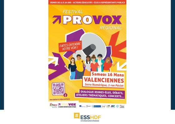 Festival ProvoxLe festival PROVOX est un événement de dialogue entre les jeunes, les élus et les acteurs éducatifs pour permettre l’implication et l’expression des jeunes sur 8 parcours thématiques différents. Cette année, il aura lieu le samedi 16 mars à la Serre Numérique de Valenciennes.