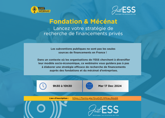 Webinaire Fondation & MécénatWebinaire consacré aux stratégies de recherche de financements privés pour les organisations de l'Économie Sociale et Solidaire.