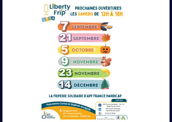 ? APF France handicap ouvre certains samedis Liberty Frip', sa friperie solidaire où chacun peut renouveler sa garde-robe tout en faisant un geste pour la planète.?