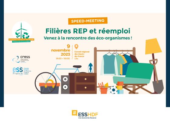 Journée Speed Meeting Filières REP et Réemploi Hauts-de-FranceVenez à la rencontre des éco-organismes ! ESS France et la CRESS Hauts-de-France animent une journée de rencontres entre les acteurs de la région Hauts-de-France et les éco-organismes nationaux le jeudi 9 novembre de 9h30 à 16h30 au siège de la région Hauts-de-France, partenaire de l'événement.