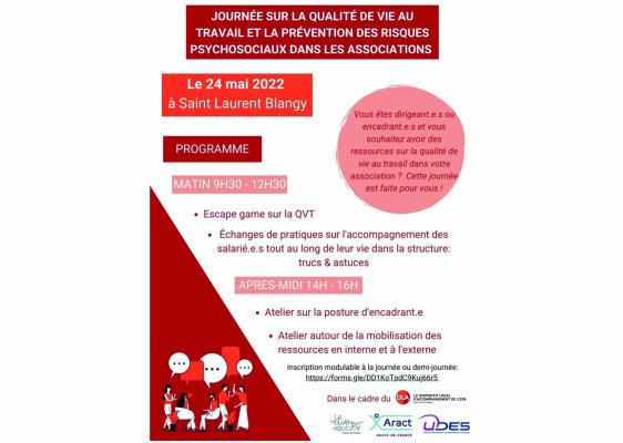 Journée sur la qualité de vie au travail et la prévention des risques psychosociaux dans les associationsVous êtes dirigeant.e.s ou encadrant.e.s d'association et vous souhaitez avoir des ressources sur la Qualité de Vie au Travail ?