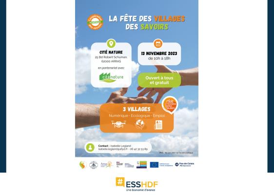 Dans le cadre du mois de l'Économie Sociale et Solidaire (ESS), nous sommes ravis de vous convier à la Fête des Villages des Savoirs qui se tiendra le 13 novembre 2023 de 10h à 18h à Cité Nature (25 Bd Robert Schuman, 62000 Arras).Durant cet événement, vous serez plongé au sein de 3 villages : l'écologie, le numérique et l'emploi. Salariés, apprenants et partenaires seront présents pour vous offrir un programme des plus complets.