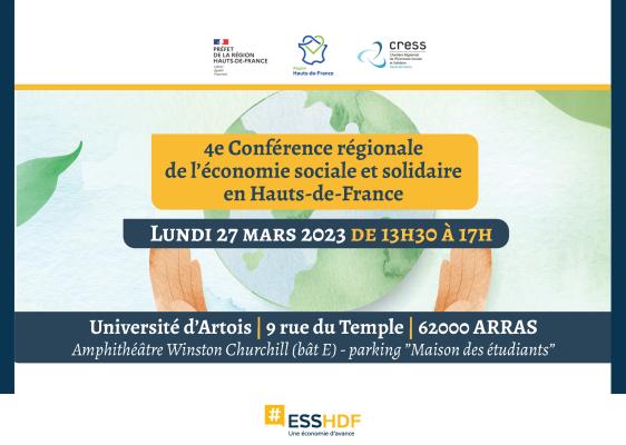 ?L’État, la Région Hauts-de-France et la Chambre régionale de l'Economie sociale et solidaire Hauts-de-France, vous invitent au lancement de la 4ème conférence régionale de l’Economie Sociale et Solidaire le 27 mars 2023 de 13h30 à 17h à l'Université d'Artois à Arras | Amphithéâtre Winston Churchill - bât E - parking ”Maison des étudiants” avec pour thème : "le temps des transitions".