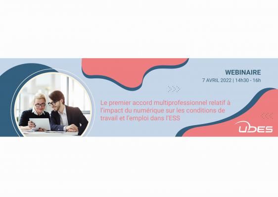 L'UDES organise un webinaire sur : « Le 1er accord multi professionnel relatif à l’impact du numérique sur les conditions de travail et l’emploi dans l’ESS »>> Inscription en cliquant ici << De 2017 à 2019, l’ANACT a, à la demande de l’UDES et en lien avec le Groupe de Dialogue social permanent de l’ESS, réalisé une étude visant à mettre en évidence les impacts des transformations numériques dans les entreprises de l’ESS ainsi que les enjeux liés à la transition numérique. Ces travaux ont jeté les bases de la déclaration commune du 14 janvier 2020, signée par les organisations syndicales, engageant l’ouverture de la négociation d’un accord multiprofessionnel relatif à l’impact du numérique sur les conditions de travail et l’emploi dans l’ESS. Les négociations se sont achevées fin 2021 et l’accord relatif à l’impact du numérique sur les conditions de travail et l’emploi dans l’ESS a été signé par toutes les organisations syndicales de salariés. Au programme : - Les résultats de l’étude d’impact de l’ANACT : Retour sur la pluralité des dimensions des impacts du numérique sur les conditions de travail, base de travail de la négociation de l’accord relatif à l’impact du numérique