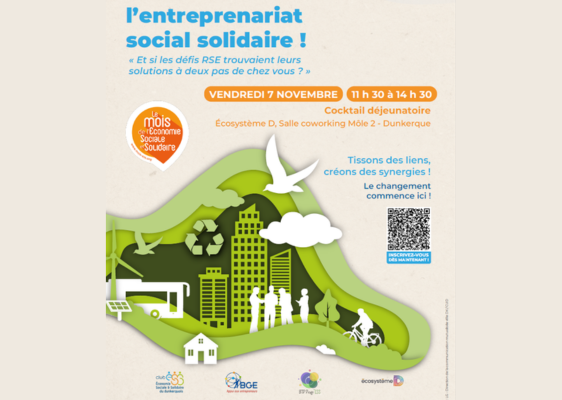 🥂 Cocktail déjeunatoire inclusCet événement, coorganisé par la Communauté urbaine de Dunkerque, ÉcosystèmeD et BGE Flandre Création, a pour objectif de créer des passerelles entre les acteurs économiques du territoire et les structures locales de l’ESS.