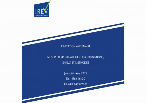 Webinaire de l'IREV "Mesure territoriale des discriminations, enjeux et méthodes" le jeudi 24 mars de 14h à 16h30.Dans un contexte de fortes demandes sociales sur les discriminations et où les acteurs manifestent un besoin d'étayage sur leur objectivation, l’IREV organise une conférence intitulée : "Mesure territoriale des discriminations : enjeux et méthodes" en visio-conférence.