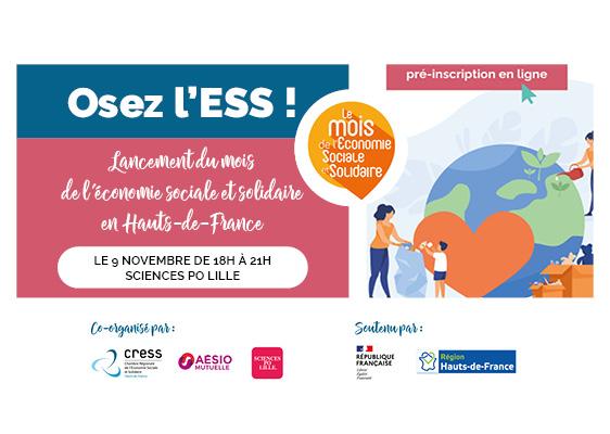 La CRESS Hauts-de-France, AESIO mutuelle et Sciences Po Lille, avec le soutien de l’Etat et la Région Hauts-de-France, vous invitent à «Osez l’ESS», le lancement du Mois de l'Economie Sociale et Solidaire dans les Hauts-de-France.