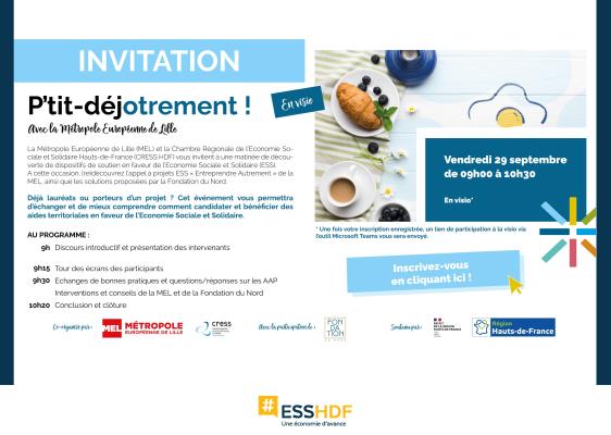 P'tit-déjotrement avec la Métropole Européenne de LilleLa Métropole Européenne de Lille et la CRESS Hauts-de-France réunissent les porteurs et porteuses de projet durant une matinée pour partir à la découverte de deux appels à projets territoriaux en faveur de l'Economie Sociale et Solidaire. (Re)Découvrez l’appel à projets ESS « Entreprendre Autrement » de la MEL ainsi que les solutions proposées par la Fondation du Nord.