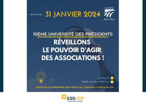Université des présidents 2024L’URIOPSS Hauts-de-France est heureuse de vous convier à la 10e Université des Présidents et administrateurs d'associations de solidarité sur la thématique "Réveillons le pouvoir d’agir des associations !"
