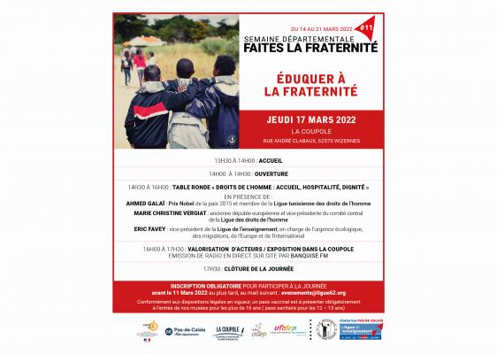 Du 14 au 21 mars a lieu la semaine départementale "Faites la fraternité". La ligue de l'enseignement Pas-de-Calais organise une journée départementale de la Fraternité, qui se déroulera au planétarium de la COUPOLE, le jeudi 17 mars prochain, à partir de 14h00.