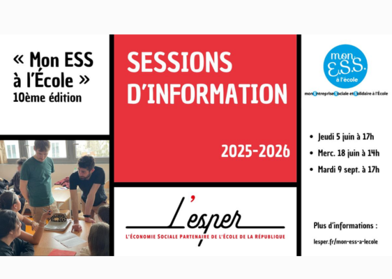 L'ESPER propose 3 sessions d'information en ligne à destination des équipes éducatives intéressées par la mise en oeuvre d'un projet « Mon Entreprise Sociale et Solidaire à l’École ». Vous souhaitez faire découvrir l'Economie sociale et solidaire à vos élèves par l'expérimentation d'un projet collectif, coopératif et d'utilité sociale ? Nous vous présenterons la démarche de projet « Mon ESS à l’École », les outils pédagogiques et les modalités d'accompagnement proposées. Après inscription, un lien de connexion vous sera transmis une semaine avant la session choisie, et renvoyé le matin même pour rappel.
