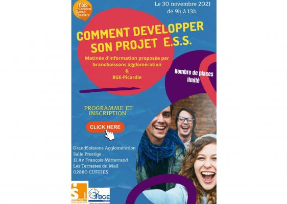 Cette matinée, intitulée « De l’idée à la mise en œuvre, comment développer son projet dans l’Economie sociale et solidaire ? », organisée dans le cadre du mois de l’ESS, se déroulera le mardi 30 novembre 2021 de 9h à 13h à Grand Soissons Agglomération dans la Salle Prestige, 11 Avenue François-Mitterrand Les Terrasses du Mail 02880 CUFFIES