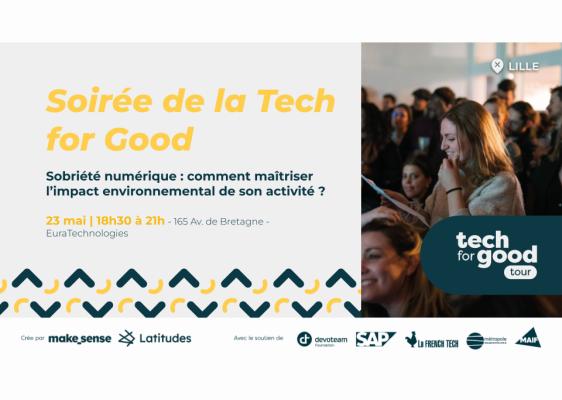 Lundi 23 maiLe Tech for Good Tour débarque à Lille pour une soirée de la Tech for Good le 23 mai à partir de 18h30 à Lille, serez-vous de la partie ? Le thème de l'événement : "sobriété numérique : comment maîtriser l'impact environnemental de son activité ?"