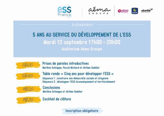 - 17h40-19h20 : Table ronde « 5 ans au service du développement de l’ESS » animée par la journaliste Edwige Coupez