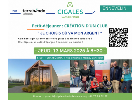 L'Association des CIGALES Hauts-de-France organise jeudi 13 mars matin un petit-déjeuner à Ennevelin, chez Terrabùndo, lieu référent de l’économie circulaire du territoire Pévèle-Carembault. Dans l’objectif d’encourager la création d’un nouveau club, ce moment convivial sera l’occasion de sensibiliser à l’épargne solidaire, d’expliquer comment fonctionne un club et d’échanger avec des citoyens et acteurs locaux intéressés par la démarche.