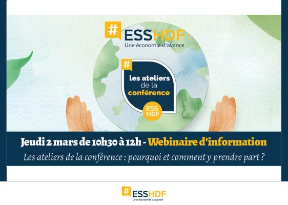 Webinaire d'information sur les ateliers de la 4eme conférence régionale ESS : pourquoi et comment contribuer ?L’État, la Région Hauts-de-France et la Chambre régionale de l'Economie sociale et solidaire Hauts-de-France organisent la 4ème conférence régionale de l’Economie Sociale et Solidaire le 27 après-midi. Cette conférence lancera un cycle de concertation ouvert à l'ensemble des acteurs de l'ESS d'avril à novembre 2023 sur "le temps des transitions" : économiques, organisationnelles, environnementales et sociales.