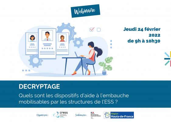 Participez au décryptage en visio : Quels sont les dispositifs d’aide à l’embauche mobilisables par les structures de l’ESS ?Associations, coopératives, entreprises de l’Economie Sociale et Solidaire ou porteurs de projet ? Vous souhaitez développer et/ou structurer votre activité à travers l’embauche d’un salarié ou plusieurs salariés ?