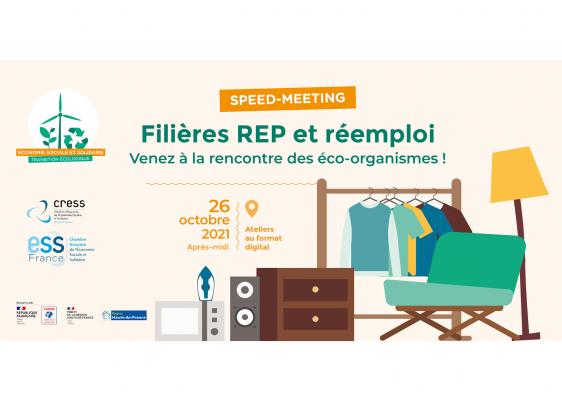 Le mardi 26 octobre de 14h à 17h Speed-meeting "Filières REP & réemploi" ESSFRANCE et la CRESS Hauts-de-France se mobilisent pour proposer aux acteurs de l’ESS des Hauts-de-France, une présentation de l’outil #carteco suivi de speed-meeting avec 5 éco-organismes : Valdelia, Refashion , ecosystem, Eco-mobilier et EcoLogic.   ** Informations et inscriptions ** - Inscrivez-vous en cliquant sur ce lien : lien d'inscription